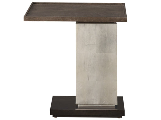 Universal FurnitureA shimmering silver leaf pedestal connects a dark walnut base to a light walnut top in this intriguing abstract side table.Product Features Top fin...