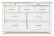 Give your retreat vintage charm and valuable drawer storage with this dresser. In a beautifully distressed whitewash finish, you'll love putting it all away in casual style. Seven full-sized drawers and two accessory top drawers will easily accommodate your needs. Generously scaled moulding from top to bottom, along with bun feet and drawer handles with a transitional aesthetic, give this dresser character—evoking the feel of a quaint cottage escape.