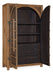 Inspired by the grandeur of wide open spaces in the American wilderness, the Big Sky Wardrobe exudes warmth with its rustic Pecky Hickory Veneers and Vintage Natural finish. The sweeping arched panel at the top of the case, authentic door hinges and wood bar hardware take you back to the heritage of post and beam construction and true craftsmanship. Behind the two doors is a removable clothes rod, two adjustable shelves and three drawers.