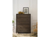 The Cocoa Chest offers versatile storage in a tall, slender profile that maximizes floor space efficiently. Finished entirely in signature Cocoa oak with subtle sandblasted texture, this five-drawer piece provides practical bedroom storage while maintaining refined aesthetic appeal.