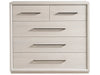 The Astrid Drawer Chest stands tall with five drawers, embodying a sleek and breezy modernity in a gorgeous neutral White Oak finish. Its stature is gracefully accentuated by long, chic bronzed pull hardware, adding a touch of sophistication to this functional piece. The chest's design strikes a balance between contemporary flair and timeless elegance, making it a versatile addition to any modern bedroom.