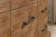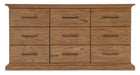 With a clean, simple silhouette, the Big Sky Nine-Drawer Dresser exudes the authenticity of open spaces in the American wilderness. Crafted of Pecky Hickory Veneers and Cedar with a solid-wood edged top and moulding on the base and top, the chest is finished in the warm Vintage Natural. The three top drawers have a removable felt liner and the top right drawer has a removable felt-lined jewelry tray. The 3 bottom drawers are cedar-lined. Dark brushed bronze bar pulls.
