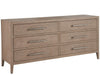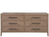 The Cove Drawer Dresser, with its six drawers set in a Gray Oak finish, features long bar hardware that accentuates each drawer, embodying a straightforward and regal design. This piece combines freshness and modernity with functionality, offering a simple yet sophisticated storage solution that enhances any contemporary space.
