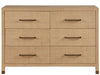 The Leah Dresser, featuring six drawers, is elegantly wrapped in raffia, presenting a textured and sophisticated appearance. Completed with bronzed bar hardware and leg accents, this piece elevates any space with its refined and distinctive charm, blending seamlessly into both modern and classic interiors.