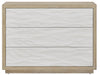 The Oasis Dresser features elegant three-drawer storage with sculptural wave-patterned drawer fronts in white, beautifully contrasting with the warm Dockside oak case. This dresser provides ample storage while soft-close drawer guides ensure quiet, smooth operation.
