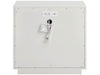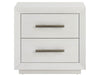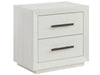 The Shoreline Nightstand is crafted from sand-blasted pine in a crisp Shoreline finish, featuring two drawers with modern bar pulls in brushed nickel. This nightstand provides ample bedside storage and convenience with built-in electrical outlets including USB and USB-C connections.