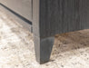 - Finish is achieved through a multi-step lacquer in a charcoal and light brown on tops.