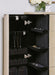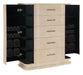 With a curved breakfront design and soft, flowing edges, the Nouveau Chic Five-Drawer Chest brings a clean neutral palette and casual modern style to your space. Crafted of Cathedral and Quartered Oak Veneers, it is finished in the serene Sandstone with light wire brushing. The stepped bracketed bar pulls in a nickel finish emulate the stepped-top dresser. A brilliant blend of fashion and function, the chest has two doors with soft-close hinges that open to reveal two felt-lined bars for hanging bracelets, 4 felt-lined fixed storage trays and 8 small black mesh bags and four large mesh bags for storing jewelry and other small items. Bottom drawer is cedar-lined.