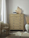 Inspired by the rugged, earthy and picturesque Malibu landscape, the Sundance Six-Drawer Chest offers a simple yet stylish silhouette crafted of Pecan Veneers and finished in the light natural Driftwood finish with light distressing including sandblasting and bleaching. Featuring 6 self-closing drawers, the top drawer has a removable felt liner, and the bottom drawers have a cedar-lined bottom. Accented by antique nickel ring and knob pulls.