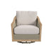 Sunset West's Cambria Barrel Back Swivel Club Chair is inspired by classic silhouettes, designed with contemporary materials. With mixed material of resin and solid teak wood, Cambria features the signature coastal teak finish and textured Latte weave. It's curved silhouette with flared skirt, barrel back and sloped arm brings maximum style and comfort.