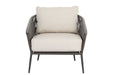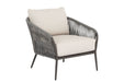 Featuring an extra wide seat, the Florence chair exemplifies comfort with deep seat and pillow back cushion. Wrapped by hand with a flat all weather rope on a curved bucket frame and tapered legs. - Stocked in Sunbrella Echo Ash - Fully Welded, rust proof aluminum frame -Wrapped in colorfast, all weather Slate rop