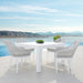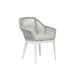 The Miami Dining Chair embodies clean lines and thoughtful angles with its angled frame and striated rope design. Its rust free aluminum frame is expertly hand wrapped with premium all-weather olefin rope in a silver-grey, and is finished with a satin white tapered leg.