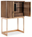Entertain in style with the Eleana Bar on Stand, a show-stopping bar cabinet that blends Light Caramel walnut veneers with Sunlit Bronze metal accents. Behind its two wood doors with magnetic catches, you’ll find a floating backlit mirror with a three-intensity touch switch, an adjustable solar bronze glass shelf, and self-closing drawers for chic storage. Perfect for dining rooms or stylish living spaces, this transitional bar stand offers both function and luxury for the modern entertainer.