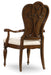A sculptured, striking silhouette with inviting alabaster-colored fabric on the front and seat and a carved, swirled ribbon-motif wood back, the Leesburg Upholstered Chair gives a fashion flair to classic style. Crafted of exquisite Mahogany Veneers, the chair features a rich finish with elegant cathedral and swirl mahogany veneers with light physical distressing for a casual appeal. Seat and back upholstery is a cotton-polyester blend.