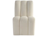 The Kylo Side Chair offers a bold reinterpretation of contemporary luxury, boasting a seat with pronounced tufting that creates a rich tapestry of deep ridges and sumptuous comfort. Clad in the sophisticated Canberra Ivory Fabric, the chair's design is accentuated by three elegantly upholstered vertical sections, each contributing to its visual allure. Mounted on sleek casters, it combines effortless mobility with a modern, refined aesthetic.