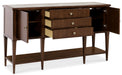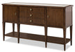 Make a sophisticated statement with the Archives Server, combining refined materials like figured walnut veneers, and a striking Castle Grey marble top. The high clarity Classic Walnut finish enhances the server’s depth and richness, while satin brass hardware adds a luxurious touch. Featuring two doors, three drawers, and an adjustable shelf, this server offers ample storage space, including a silverware tray. Perfect for the dining room, this piece offers both practical function and timeless design, ideal for those who appreciate structured elegance.