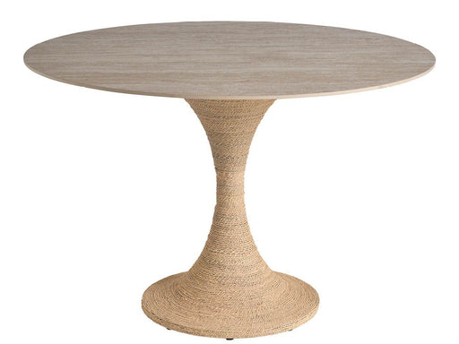 Universal FurnitureThe Oasis Dining Table features a 44-inch round stone top in Travertine Beige beautifully supported by an hourglass-shaped base wrapped in natural ...