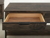 2 Drawer, 1 Shelf Sofa Table. Inspired by transitional design, the Dark Mita occasional tables elegantly combine the warmth of wood with the sleek industrial style of metal elements. Each piece in this collection is expertly crafted from sustainable mango and melina wood, hand-distressed to create a captivating finish that showcases its natural grain patterns. In addition to its attractive design, the Dark Mita collection offers practical features. The sofa table includes a sturdy metal base for support, a spacious tabletop for everyday use, two drawers with sleek black handles for storage, and a lower shelf ideal for displaying decorative items or organizing books and magazines. This combination of style and utility ensures the Dark Mita collection is a beautiful and functional addition to any living space.