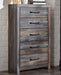 When merged in just the right way, rustic and industrial styles can make one happy marriage. Case in point: this bookcase bedroom group with storage. A refined take on barn board beauty, its complex, replicated wood grain showcases hints of burnt orange and teal tones for a sense of weatherworn authenticity. Three open cubbies lined with a dimming LED light strip keep bedtime reads top of mind. Underneath the bed: four smooth-gliding drawers and four open cubbies that accommodate casually cool storage bins.