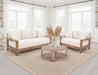 Wooden Frame, Upolstered Loveseat. Transform your living space with this stunning wooden-framed loveseat, which perfectly combines craftsmanship and comfort. The Duna Collection loveseat features two back cushions upholstered in a pearl fabric, providing plush support and an elegant touch. What truly sets this collection apart is its beautifully designed, flat armrests, enhancing its aesthetic appeal and ergonomic comfort. The defined wooden frame and legs, with their intricate detailing, showcase timeless sophistication. Redefine your space with furniture that makes a statement because every home deserves a touch of artistry.