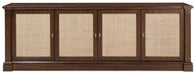 The Archives Entertainment Console brings a sophisticated blend of materials and finishes to your home entertainment space. Featuring four woven-cane panel doors and adjustable shelving, this console is designed to accommodate an 80" flat-screen TV, offering style and functionality. The high-clarity Classic Walnut finish over walnut veneers adds warmth and richness, while the ventilated back panel ensures your electronics stay cool. Ideal for those seeking a luxurious, yet practical piece to enhance their living room.