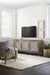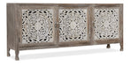 Exquisitely hand carved Mango Wood on the front of this three-door entertainment console creates an iconic and imposing stylish look for your home. The serene neutral finish is accomplished with a cream glaze and heavy distressing over a medium wood tone. Antique bronze-colored bar pull hardware with a cream glaze completes the look. Featuring 3 doors, the left pair of doors has one fixed shelf behind, and the right door has one fixed shelf behind, and there is a ventilated back panel. Accommodates up to an 80-inch TV.