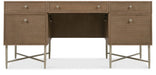 Mixing Quartered, Cathedral-Cut Oak in an earthen-toned finish with cane-front drawers and a metal base, stretchers and tapered legs, the Sonnet Executive Desk blends natural textures with a refined minimalist silhouette. The five drawers have cane-inset fronts, and there’s a removable/interchangeable writing surface and pencil tray that can be used in either the right or left top drawer. Each of the top side drawers has two removable partitions. The center drawer has a drop-front writing surface and wire management. Two locking file drawers have a Pendaflex letter/legal filing system.