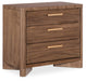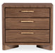 Designed for convenience and style, the Eleana Three Drawer Nightstand features Light Caramel walnut veneers, plated bronze hardware, and rounded corners. Its integrated charging station with dual outlets, along with three self-closing drawers, makes it both functional and luxurious for bedside storage.