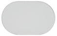With its white textured finish and beveled glass inset, this oval end table brings light and elegance to your décor. Ideal for minimalist or coastal-inspired spaces.