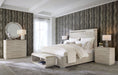 Softly sophisticated with a clean modern profile and luxe mixture of materials, the Modern Mood Bachelor’s Chest is a stunning statement piece. The case has rounded corners and a plinth base and offers five self-closing drawers. The top two drawers are felt-lined, and the bottom drawer is cedar-lined. Crafted of Oak Veneers, the nightstand is finished in the serene Diamond color and accented by metal pulls wrapped in leather.
