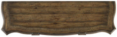 Classic European design elements and a relaxed rustic finish come together on the shaped silhouette of the Rhapsody 12-drawer dresser with an intricate acanthus leaf base molding and jewelry-like antique silver shaped drawer hardware. The timeless dresser is made casual walnut-colored rustic reclaimed finish. The center drawer has a drop front to accommodate wire management and electronics, and the three bottom drawers are cedar-lined.