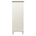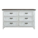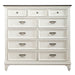 The two-toned wire brushed white finish with charcoal top adds a taste of vintage, allowing this piece to work from the mountains to an industrial loft. The charcoal top is accented by planks while the white base is highlighted by bead molding and antique pewter hardware. Crafted of rubberwood solids with cathedral white oak tops, this piece features fully stained interior drawers, full extension drawer glides for easy access to storage, felt lined top drawers, and is anchored by tapered feet. Style uncompromised with storage abound, enjoy the ample drawer storage, each equipped with bottom case dust proofing.