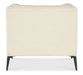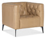 The Nicolla Stationary Chair in performance offers a stylish, modern traditional design. With a chesterfield-inspired shelter arm design and button tufted interior, the chair stands out with its light, airy appearance, thanks to tall metal tapered legs.