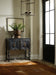 With a vintage charm, the black hand-painted leg chest with rub-though is nostalgic and timeless with turned legs and a stretcher, a shaped base and ring pulls on decorative back plates. Two doors with one adjustable shelf.