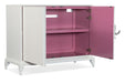 Sleek and modern meets soft and soothing with the Unity Chest. Part of a curated collection to honor the spirit and courage of those diagnosed with breast cancer, the chest contrasts a creamy white exterior with a magenta-colored interior, accented by antique pewter ribbon-designed hardware. The two doors have soft-close hinges and one adjustable shelf behind each. Crafted of Maple Veneers, a portion of the proceeds from each chest sold goes to the Susan G. Komen Foundation.