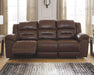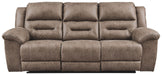 For those that love the cool look of leather but long for the warm feel of fabric, this power reclining sofa delivers both with ease. Its high-performance padded faux leather is remarkably durable and easy to clean, just the thing for family spaces. When it's time to relax, the one-touch power control puts the perfect position at your fingertips. Channel-stitched back cushions provide indulgent lumbar support for maximum seating comfort'not to mention fashion-forward flair.