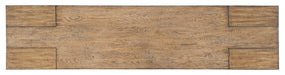 With the look of an authentic woodworker’s design, the chunky and chic Commerce & Market Console has block legs, and the top and legs have an interlocking pattern. Crafted of Solid Mindi Wood, the console has a natural light wood finish.