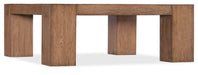 Chunky and chic, this generously-scaled Commerce & Market Square Cocktail Table is a bold expression of modern style with an organic color scheme. It features block legs, and the top and legs have an interlocked design. Crafted of Solid Mindi wood with a natural wood finish.