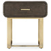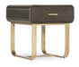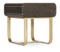 The Metropolitan End Table is a soft modern silhouette combining Oak Veneers in a dark wood finish with a rounded gold metal base and accents.