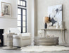 Earthy texture meets glam with the Guilded Accent Table in this stepped design with contrasting silver leaf insets. Gray-finished Primavera Veneers are paired with silver leaf accents on the stepped insets. Featuring an appealing round shape, the table has casters for easy mobility.