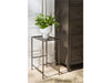The Metal Side Table features sleek design with a distinctive tray top and a minimal geometric frame in Smoked Gold finish. This compact accent piece provides flexible surface space while showcasing a sophisticated metallic finish that complements the transitional aesthetic beautifully.