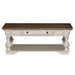 Combine traditional living and todays modern lifestyle effortlessly with the Morgan Creek. Crafted of poplar solids with pine and birch veneers finished in antique with spatter and watermark accents with a planked top. Features pewter nail head corner accents, one full extension drawer in each table, a bottom shelf for additional storage, cocktail is castered for easy moveability, anchored by round turned legs flowing into bracket feet. The warm antique finishes and artistic distressing along with grand scale, makes this collection can be passed on for generations. Kit consists of one rectangle cocktail table and two rectangle end tables.
