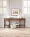 Crafted of Birch and Acacia wood with contrasting dark ferrules on the tips of each of the 8 slim legs, the Skinny Console Table exudes character and charm. Finished on all sides, this versatile piece is only 14 inches deep, allowing even the tightest spot to have a functional focal point piece. One fixed shelf.