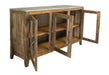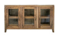 3 Glass Door Console. The Tulum collection, drawing inspiration from organic design principles, is meticulously fashioned from sustainable wire-brushed mango wood and impeccably finished by our artisans in a natural wood tone. Additionally, this collection showcases metal bases coated in a light brown electrostatic paint. With its serene essence, the Tulum collection guarantees to infuse any space with a Zen-like natural ambiance.