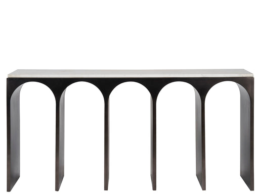 Universal FurnitureThe Quill Console Table presents a sleek, abstract expression in design, featuring a White Travertine top elegantly perched on a pedestal of Alumin...