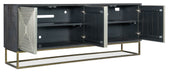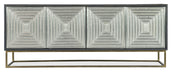 Neoclassic forms get a modern flair with the Dimensions Credenza. Crafted of Mango Solids in a black natural wood finish with a brushed pewter metal base, the piece has distinctive silver-colored iron clad door fronts in a diamond-like pattern. The 4 doors have soft-close hinges and touch latches with one removable shelf behind each pair of doors. The interior finish matches the outside of the case. A ventilated back panel and wire management makes the credenza media-friendly.