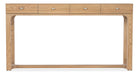 A sleek silhouette combines with an organic light natural pecan finish over Pecan Veneers to create a simple chic design in the Documents Console. The narrow rectangle design is only 16 inches deep and 64 inches wide. Pewter oval knobs add a finishing touch.