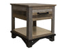 1 Drawer End Table. The Loft Brown Collection is constructed using pine wood that has been hand-stained and distressed, complemented by hand-forged iron hardware. This beautiful collection features a wide range of high and low finish colors, making it a striking addition to any room décor you choose to design.