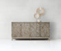 With a delicate and delightful grooved quatrefoil pattern on its doors, the Fairfax Credenza is crafted of Oak Veneers and Aluminum Sheet, accented with silver-colored zinc alloy tab pulls. The wood is in a distressed medium finish with hand planking. Four doors with one adjustable wood shelf behind each set of doors. Ventilated back panel.