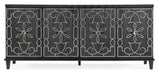 With a Moroccan flair and an elegant black and silver color scheme, the Madeline Credenza is crafted of Pine Veneers with a black wood finish, textured metal hexagonal knobs and silver floral motif accents. With four doors, there are two drawers behind each pair of center doors, two adjustable shelves behind each outside door and one fixed shelf above the drawer in the center section. Ventilated back panel with hand holes.